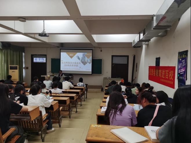 为积极响应中国证券业协会“投资者教育进百校”的活动倡议,树立理性科学投资理念,提升在校学生金融知识素养,培养在校学生金融风险防范意识,2023年10月18日财税金融学院联合东方财富证券投资者教育基地,在综合楼第一阶梯教室举办了“投资者教育进百校——学北交所深改知识,明改革举措意义”投教活动。东方财富证券公司经理王剑,合规经理何鸿源,财税金融学院相关教师出席了本次活动,活动由李绍老师主持。